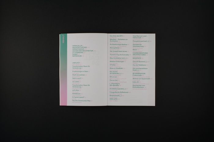 ISBN 978-3-9505816-0-7, erste Auflage, Wien, April 2025, DIN A5, Hochformat, 220 Seiten, 42 Beiträge, herausgegeben vom Verein Architekturtage.