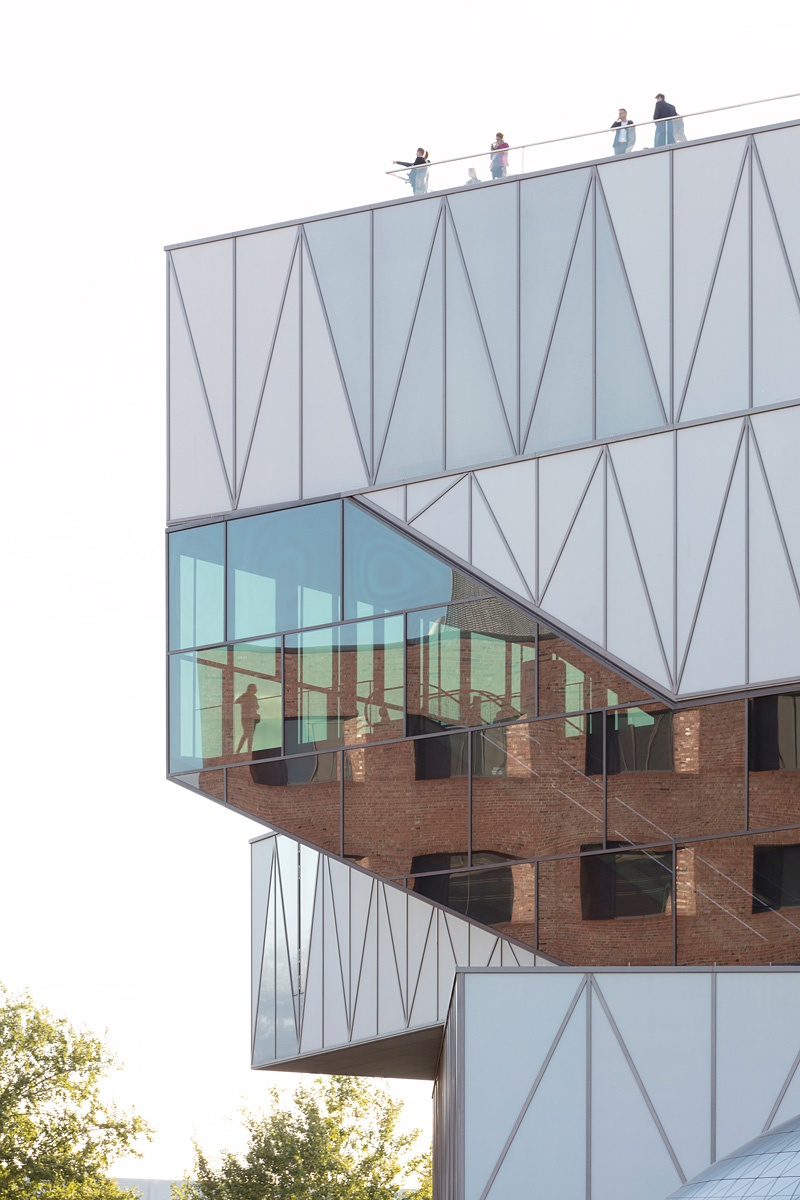 Der zweite, ebenso wichtige Punkt: Sauerbruch Hutton schmiegen die beiden großen Neubauteile des Museums handschuhartig in die existierende Stadtstruktur und verzichten darauf, den Neubau mit einem „Glacis“ zu umgeben, ihn auf dem Präsentierteller zu zeigen. Der Überraschungseffekt ist umso größer, wenn man zwischen den Gassen der neu zusammengefügten Stadtfragmente plötzlich auf die wie aus dem Nichts aufsteigenden rot, grau und weiß geflammten Keramikwände des Museums trifft, die das Ziegelrot der Umgebung spiegeln. Diese Architektur ist nahbar und damit ist das Museumsquartier M9 auch ein ästhetisches Lehrstück in der Weiterentwicklung der europäischen Stadt. Es bringt eine für die Zukunft des „Urban-Reuse“ wichtige Botschaft zum Ausdruck, indem es selbstbewusst darauf vertraut, auch im Verborgenen groß sein zu können.