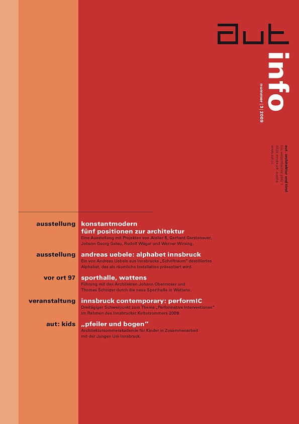 Mit „konstantmodern. Fünf Positionen zur Architektur“ und „Andreas Uebele: Alphabet Innsbruck“ stehen zwei Ausstellungen im Mittelpunkt dieser Ausgabe der aut: info. „konstantmodern“ widmet sich mit Atelier 5, Johann Georg Gsteu, Gerhard Garstenauer, Rudolf Wäger und Werner Wirsing fünf Architekturpositionen der zweiten Hälfte des 20. Jahrhunderts aus Deutschland, Österreich und der Schweiz, die trotz ihrer Unterschiedlichkeit eines auszeichnet: eine konstant moderne Haltung, die sich nicht nur in ihren Architekturprojekten, sondern vor allem in den dahinter liegenden „ethischen“ Einstellungen manifestiert. Diese Haltung wird in der Ausstellung und der dazu im Springer Verlag erscheinenden Begleitpublikation anhand von jeweils drei, von den Architekten selbst ausgewählten Projekten aus unterschiedlichen Schaffensperioden vermittelt.