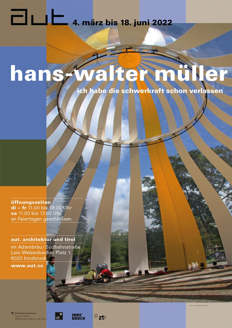 Die gemeinsam mit Hans-Walter Müller konzipierte Ausstellung "Ich habe die Schwerkraft schon verlassen" bietet mit Fotografien, Filmen und Objekten aus Müllers umfangreichem Archiv sowie einem eigens für unsere Räume entwickelten Volumen mit Ton und Projektion einen Einblick in das Schaffen dieses Pioniers des Bauens mit Luft. Zu sehen ist auch ein Film von Lukas Schaller, der im Auftrag des aut Hans-Walter Müller 2019 in seinem Lebensmittelpunkt in La Ferté-Alais besuchte.