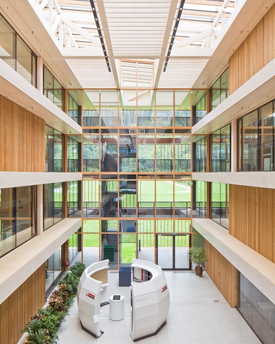 Für das Egger „Stammhaus“ plante Moser ein viergeschossiges Gebäude in Holzrahmenbauweise mit einem großzügigen Atrium und hellen, freundlichen Büroräumen. Im Innenausbau kamen überwiegend Eigenprodukte des Unternehmens zum Einsatz, das Gebäude wird damit zum direkten Werbeträger.