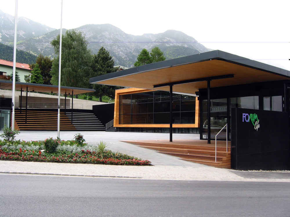 An einem südseitig geneigten Hang und in unmittelbarem Umfeld von Kirche, Gemeindeamt und Friedhof befindet sich das neue Veranstaltungszentrum der Marktgemeinde Rum. Das Innsbrucker Architektenteam Freisinger/Gruber konnte 2004 den EU-weit offenen Architektenwettbewerb mit einem Projekt gewinnen, das in Rücksichtnahme auf den dörflichen Charakter der vorhandenen Bausubstanz entwickelt und teilweise in den Hang eingegraben ist. Der aus ein- und zweigeschoßigen Gebäuden bestehende Komplex mit Büro- und Geschäftsflächen, einer Arztpraxis, einem Café und dem eigentlichen Veranstaltungszentrum mit multifunktionalem Raumkonzept fügt sich maßstäblich in die Umgebung ein. Die neuen Bauteile gruppieren sich gemeinsam mit dem sanierten, alten Gemeindehaus um den neuen Rathausplatz, der über eine versenkbare Glasfront mit dem großen Saal verbunden werden kann.