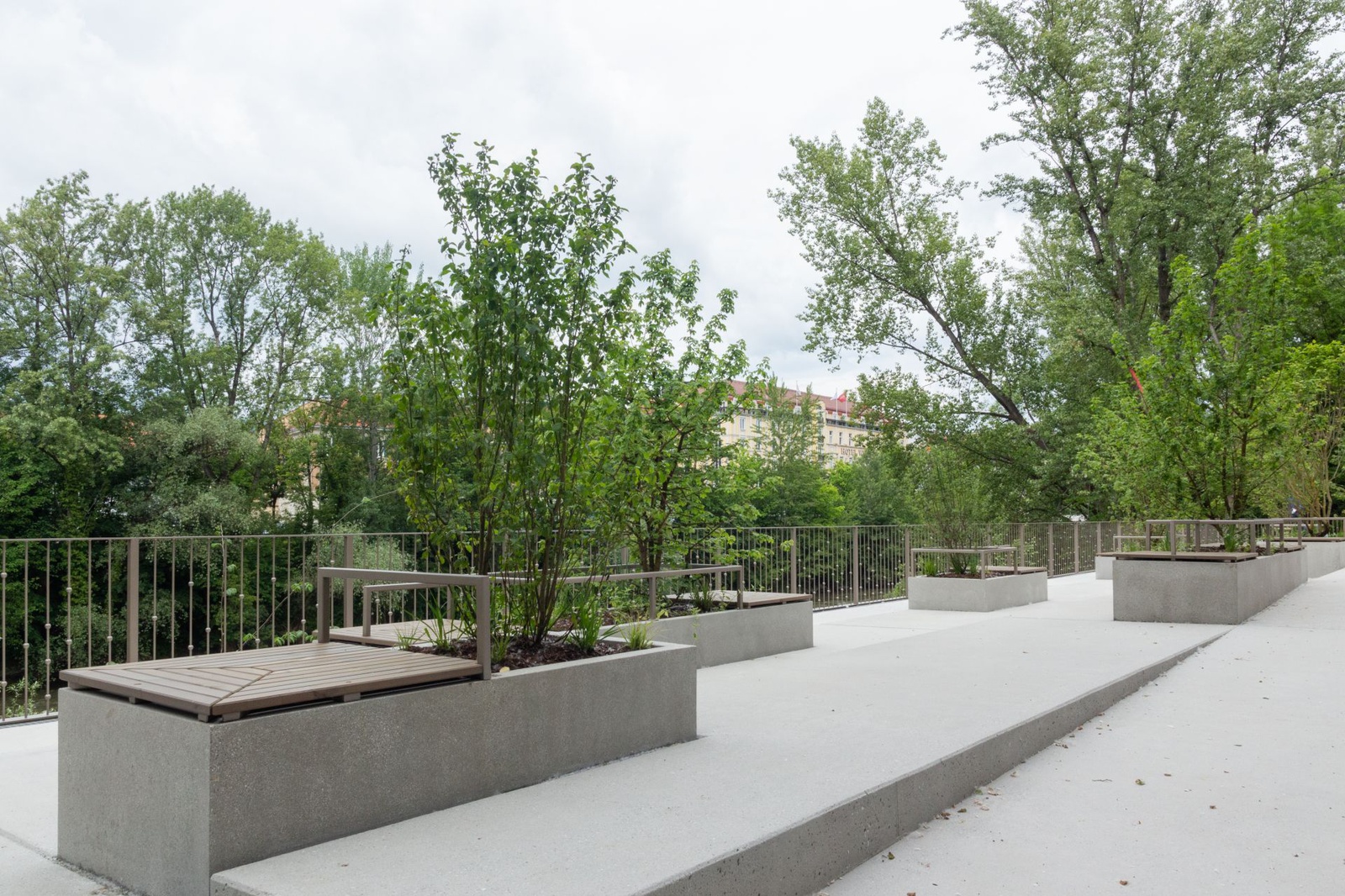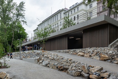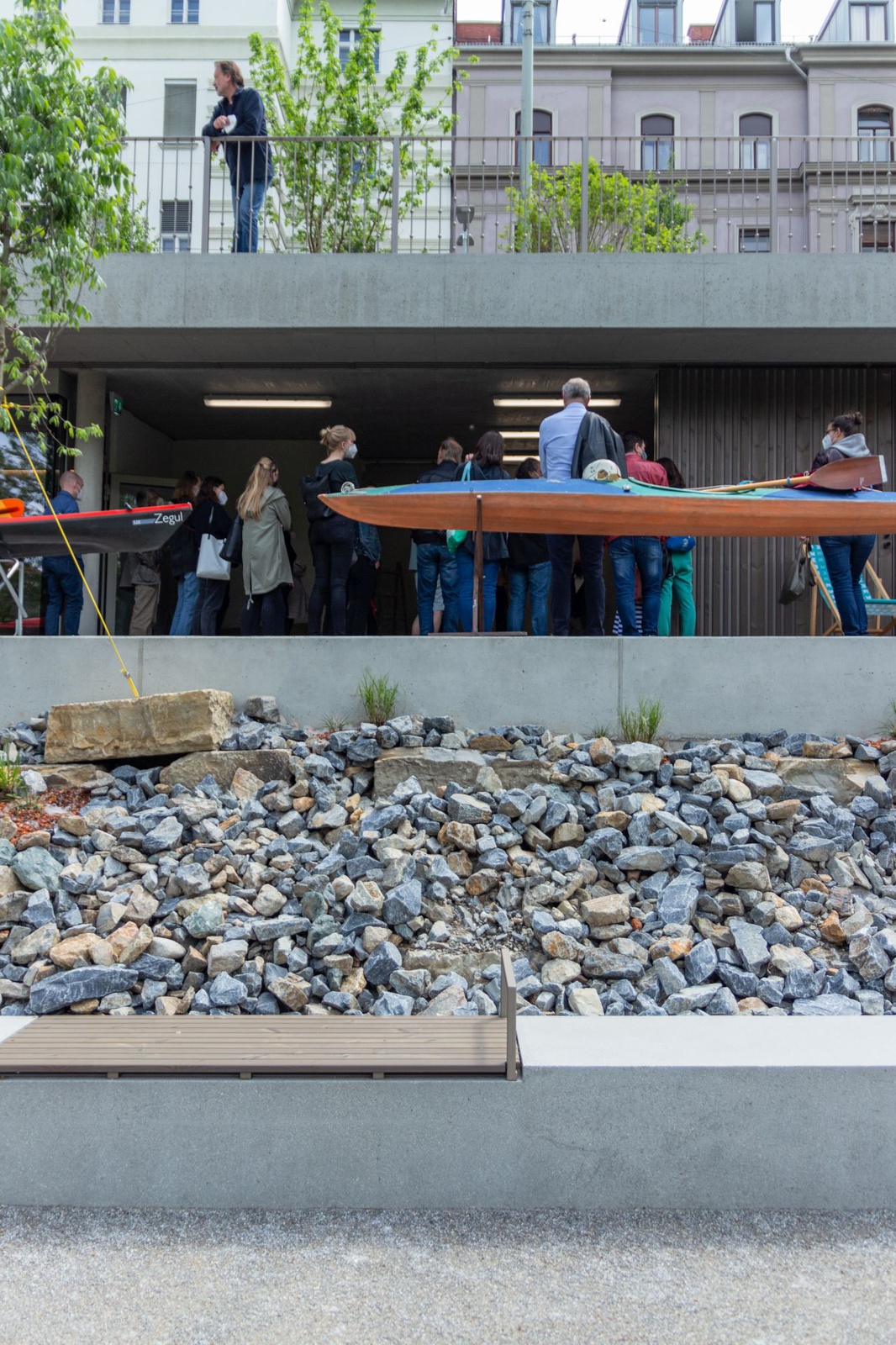 Das schmalgezogene, in die Hanglandschaft integrierte Bootshaus schafft unterschiedliche Außenraumqualitäten auf verschiedenen Ebenen und integriert die Mur wieder spürbar in den Stadtraum. Das direkt vom Kai aus begehbare Gebäudedach ist zum Fluss hin abgetreppt und dient den StadtbewohnerInnen und -flaneurInnen als Sonnenterrasse zum Verweilen und als Zusehertribüne bei Vereinsaktivitäten des „Kanu Club Graz“ und „Grazer Kajakclub Wikinger“.