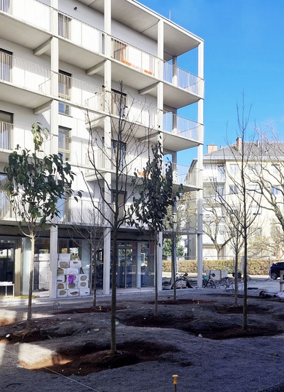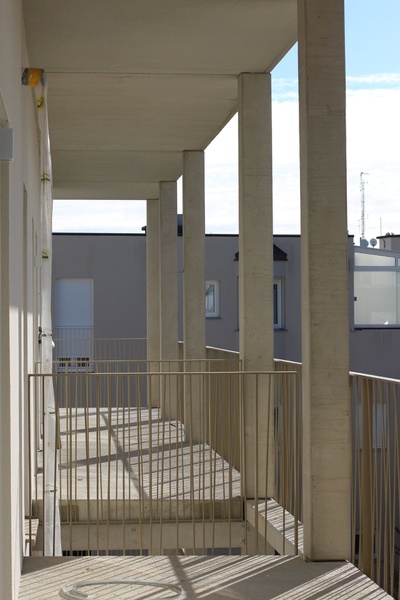 Die Wohnbebauung, eine Gruppierung von fünf Punkthäusern mit verschiedenen Höhen, reagiert städtebaulich auf die umgebende Bebauungsstruktur, die vorwiegend aus Einzelobjekten unterschiedlicher Größen und Höhen besteht. Es entsteht ein vielschichtiges Außenraumangebot mit differenzierten Übergängen von öffentlichen zu halböffentlichen und privaten Freibereichen.
