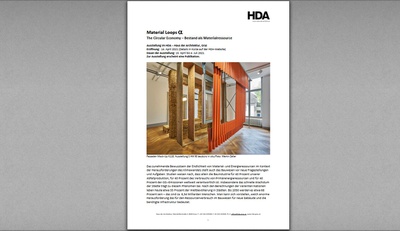 Die Endlichkeit von Material- und Energieressourcen stellt das Bauwesen vor neue Fragestellungen und Aufgaben im Kontext der Herausforderungen des Klimawandels. Die Ausstellung im HDA widmet sich dem Thema "Materialkreislauf". Sie stellt Studien und praktische Beispiele von Architekturen, Umnutzungen und Systemkreisläufen vor, die durch ihre hohe gestalterische Qualität sowie durch ihre beeindruckende Genese aus wiederverwendeten Materialressourcen überzeugen.