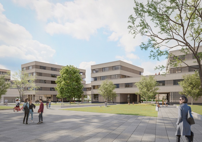 Der fünfgeschossige Hauptbau korrespondiert mit den umliegenden Institutsgebäuden, während die niedrigeren Volumina entlang der Sandgasse für großzügige Abstände sorgen. Die Dachflächen über dem ersten Stock werden als Freiräume nutzbar gemacht. Gemeinsam mit den Dachterrassen und zentralen Aufenthaltsbereichen fördern sie gezielt den Austausch und die Kommunikation zwischen den Nutzungseinheiten.