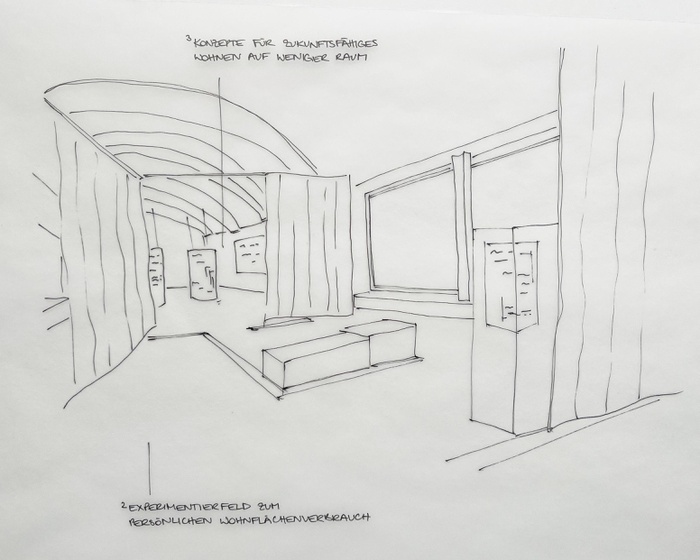 Ein interaktives Raumfeld lädt Besucher:innen dazu ein, den eigenen Bedarf praktisch zu erproben: Wie viel Platz brauchen wir wirklich zum Wohnen, Arbeiten oder Zusammenleben? Ergänzt wird diese Erfahrung durch Fakten, Daten und Zukunftsszenarien rund um das Wohnen – von geteilten Räumen über neue Wohnmodelle bis hin zur Umnutzung leerstehender Einfamilienhäuser.