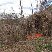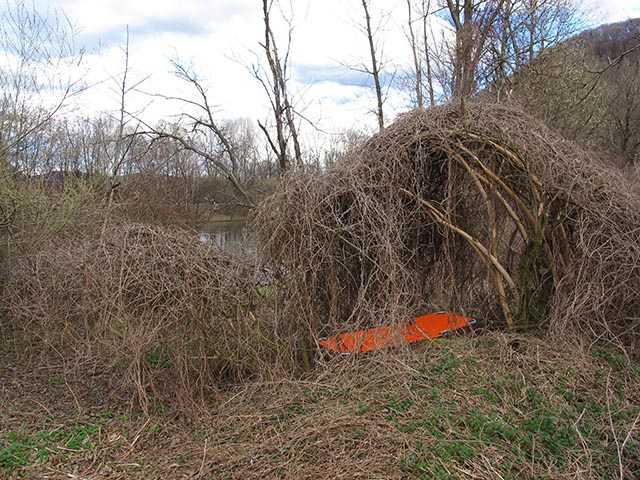 Cabin ist ein in dieser Form am Flussufer gefundenes, natürlich gewachsenes Dickicht. In Erinnerung an die Kindheit, als man sich in solchem Strauchwerk – fernab der Welt der Erwachsenen und diese zugleich nachahmend – spielerisch häuslich einrichtete, erkennen RESANITA einmal mehr die Form der Unterkunft, des Habitats vielleicht. Mit der exakten Übertragung der gefundenen Form aus der Natur in den Kunstraum wird diese zur Installation und Modell ihrer selbst. Ein Environment, das, etwa in Konnotation zu Vitruvs Urhütte, in die Auseinandersetzung um die Begriffe Natur und Technik führen mag.