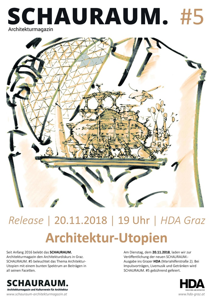 Die neueste Ausgabe von SCHAURAUM. wird wieder im HDA präsentiert – der Abend wird mit Impulsvorträgen und einer Diskussionsrunde zum Thema Architektur-Utopien eingeleitet. Anschließend wird SCHAURAUM. #5 bei Livemusik und Getränken gebührend gefeiert.