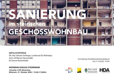 Aufgrund der aktuellen Corona-Situation wird der 3. WOHNBAU.DIALOG STEIERMARK erstmals als virtuelle LIVE Veranstaltung durchgeführt. Dieser Stakeholder-Workshop befasst sich mit dem Thema Wohnbausanierung. Hierzu werden VertreterInnen von Land und Stadt sowie WohnbauträgerInnen und Fachleute für Sanierungen eingeladen sich einzubringen. Anmeldung bis 21. Oktober, 14:00 unter kontakt@wohnbaudialog.at
